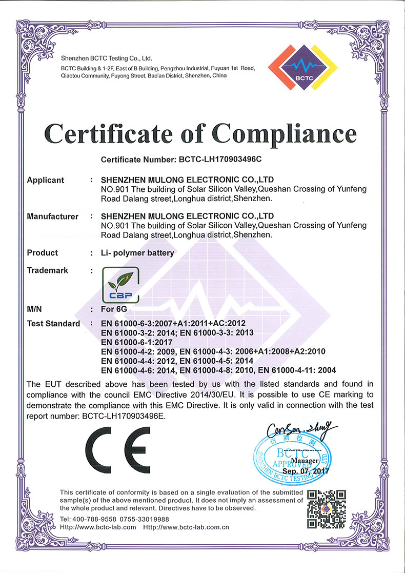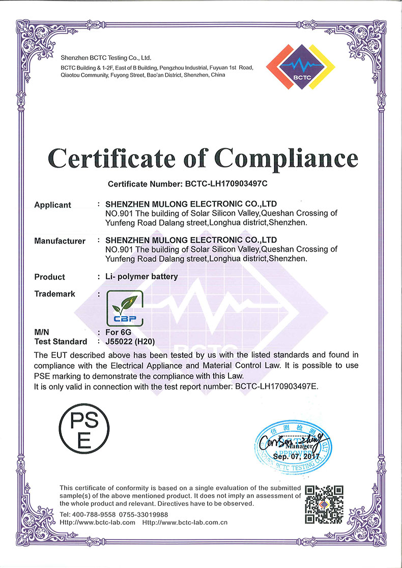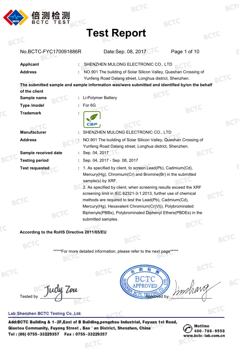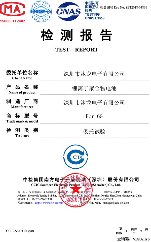 惠州市沐龍電子科技有限公司成立于2007年,所生產(chǎn)iphone替代電池已經(jīng)獲得歐盟ROHS CE證書,日本強(qiáng)制性認(rèn)證PSE證書,符合國際航空UN38.3安全標(biāo)準(zhǔn), 上天貓質(zhì)量檢測報告。