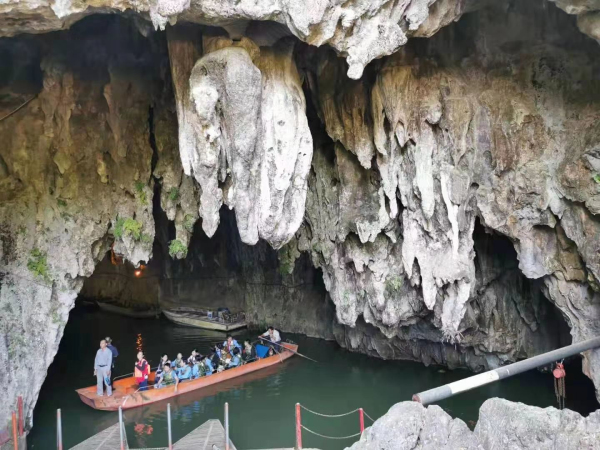 經(jīng)過3個多小時的行程,我們在中午到達此次旅程的第一站【仙橋地下河】。其擁有亞洲第一長地下暗河,享有“華南第一美洞”之美譽,由兩段暗河和一段明河聯(lián)成,全長13公里,目前開發(fā)可游覽3.8公里,是一處非常神秘的自然奇觀。洞中有河,河中有洞,五顏六色的溶洞,千奇百怪的形狀讓小伙伴們紛紛嘆為觀止,感慨大自然的偉大和神奇。