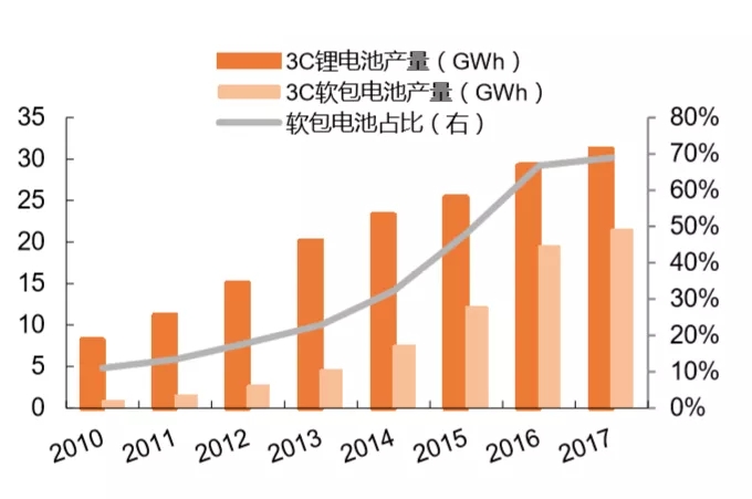 3C市場軟包電池占比逐年提升